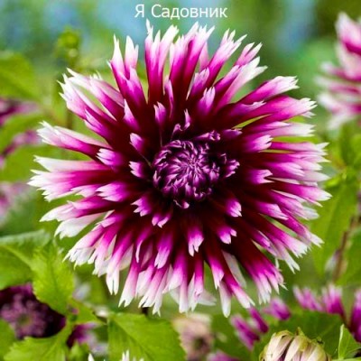 У георгины прямой и высокий стебель. Он покрыт небольшими листьями и украшен крупными цветками. Они состоят из множества пурпурных лепестков с белыми кончиками, которые свернуты в трубочки. Стебли образуют пышный куст.